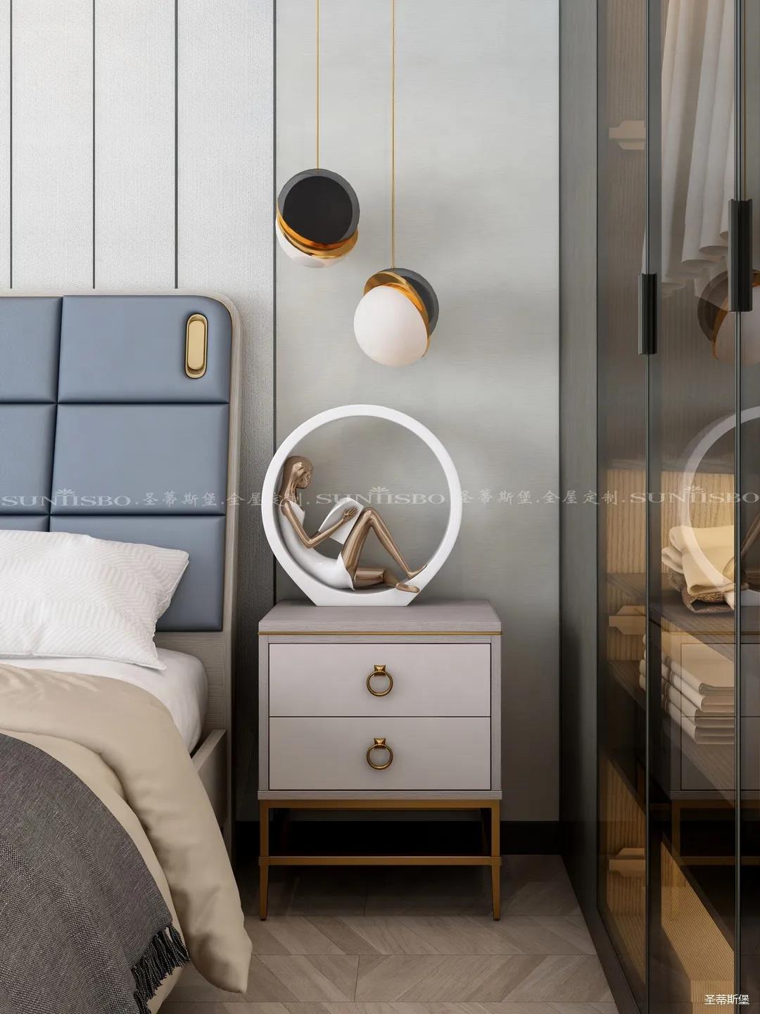 臥室的設(shè)計(jì)繼續(xù)延續(xù)著空間的高級(jí)灰,藍(lán)灰色彩的對(duì)比,讓主臥空間層次感更加豐富,充足的陽(yáng)光隨意散落,空間更加溫暖大氣,對(duì)稱的球形吊燈設(shè)計(jì),恍如兩個(gè)“快樂(lè)星球”,展現(xiàn)著空間應(yīng)有的藝術(shù)性,設(shè)計(jì)師巧妙地設(shè)計(jì),營(yíng)造出與眾不同的生活品質(zhì)。