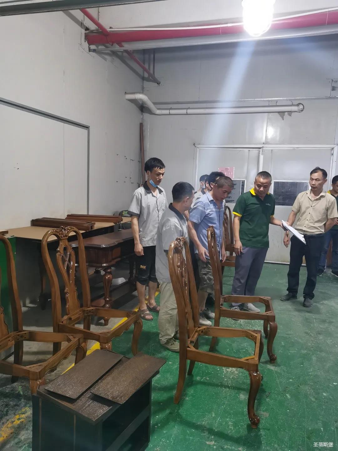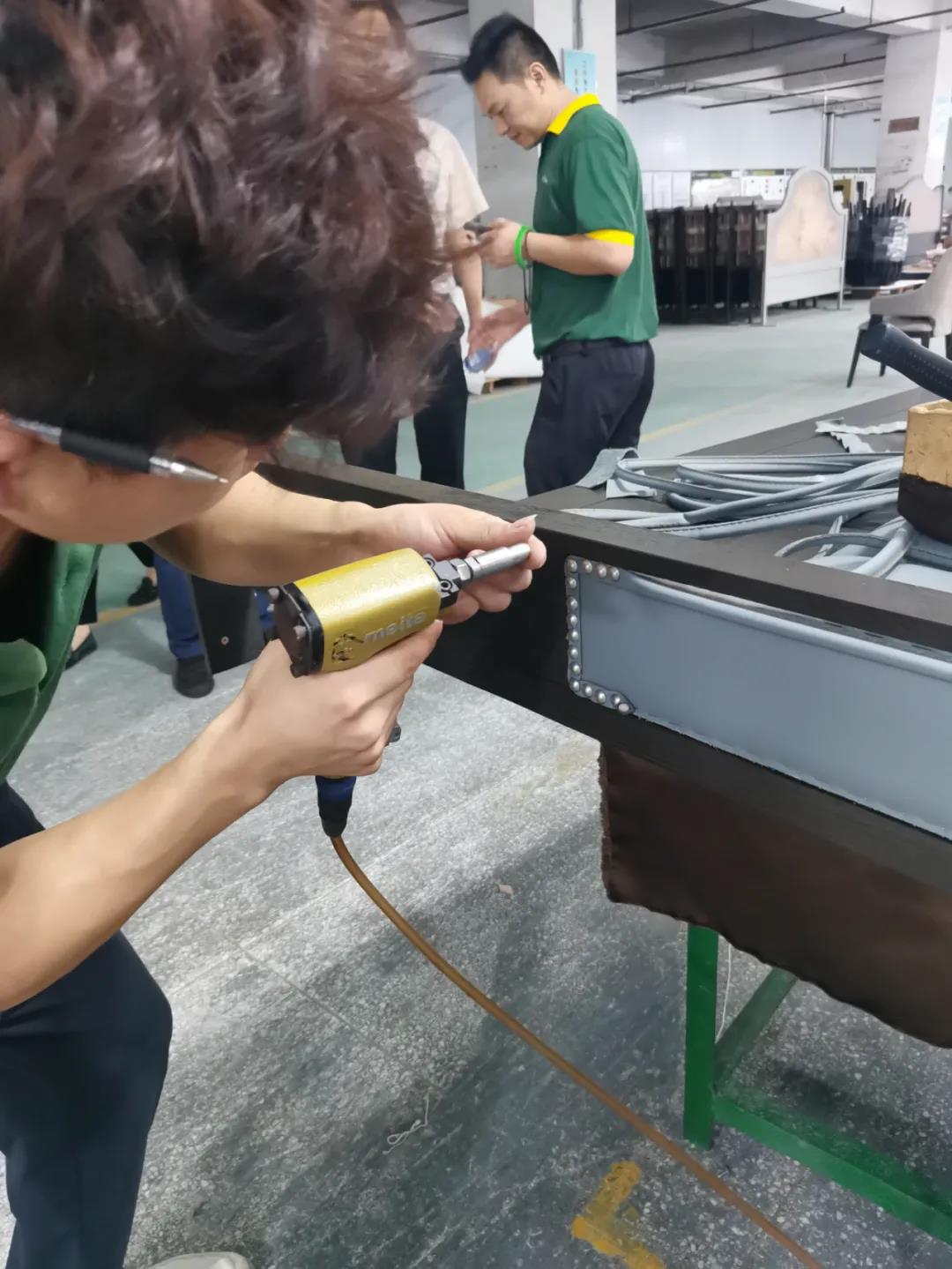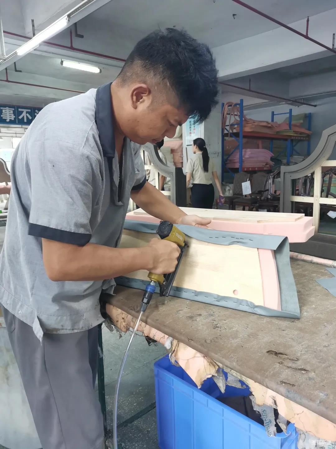 本屆技能競賽設置為工業(yè)組和商業(yè)組,共設競賽項目8項,其中,工業(yè)組競賽包含了打滾邊、打銅釘、自身產(chǎn)品組裝、成品組裝、柜體噴底色、修色、板材開料等七大細項。商業(yè)組以組裝辦公臺、床頭柜為主。