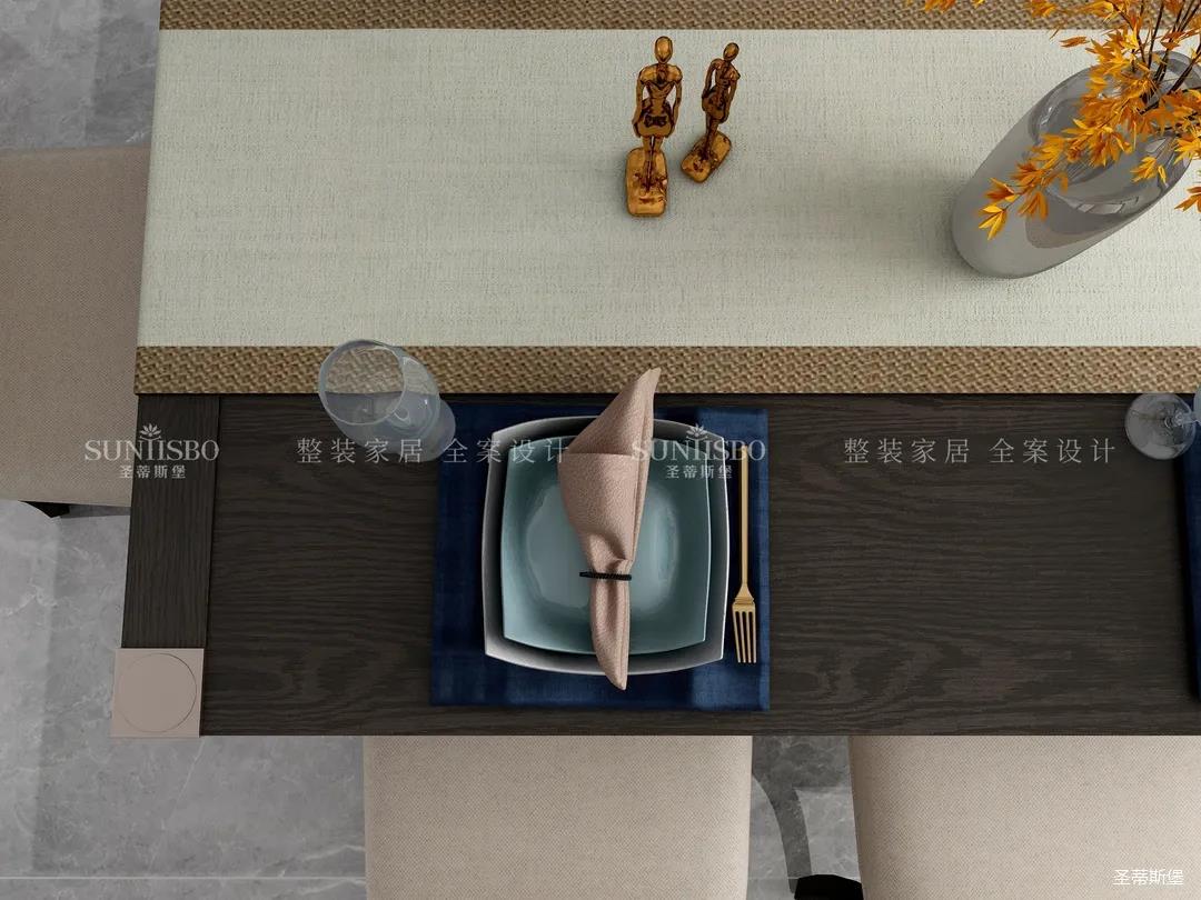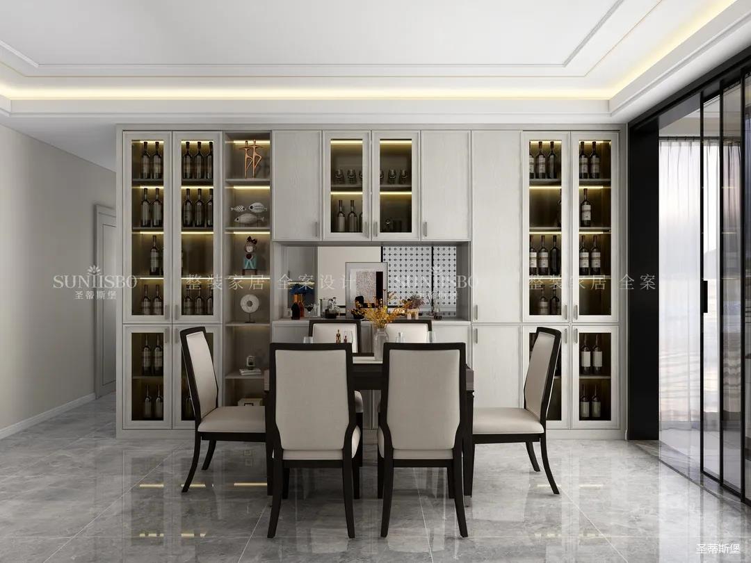 餐廳和客廳以大橫廳的形式展開,設計師將實木、玻璃、皮質、金屬等看似相互排斥的元素相互重組,讓餐廳呈現多元式的輕奢氛圍。深淺色彩,對稱型的定制柜,都讓空間形成強有力的質感對比。無論是午餐窗外的車水馬龍,還是晚宴的點點繁星,都能給屋主帶來良好的就餐體驗。